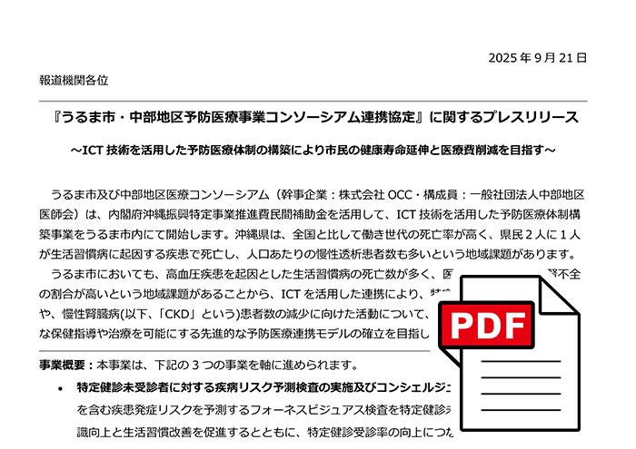 OCCと中部地区医師会が参画する「中部地区予防医療コンソーシアム」とうるま市は、連携協定を結びました。 ICT技術を活用して医療機関などと協力し、うるま市民の健康増進を目指します。 特定健診の受診者数を増やし、新たに人工透析が必要になる患者を減らすことを目標に、予防医療の体制を整えていきます。